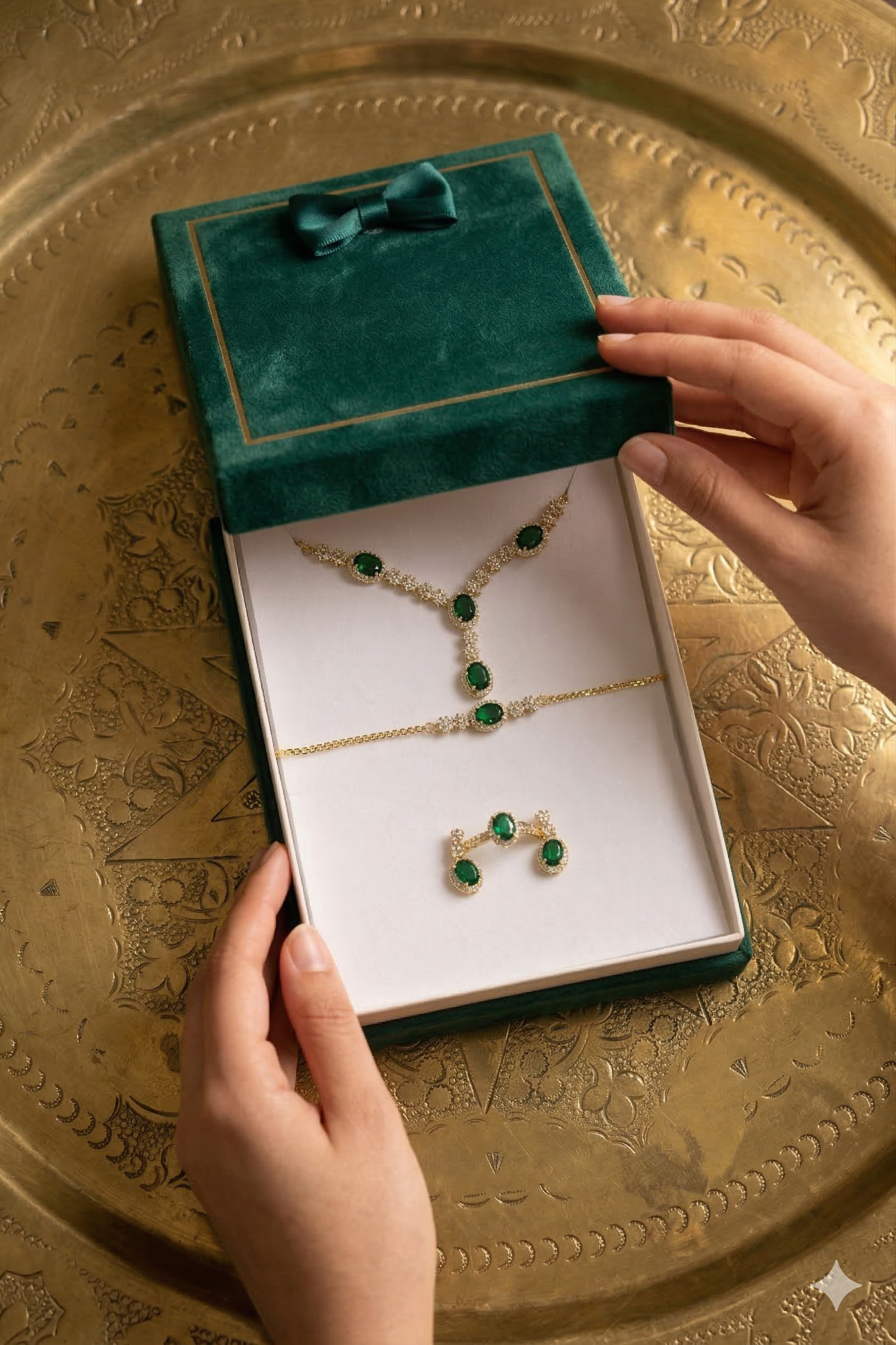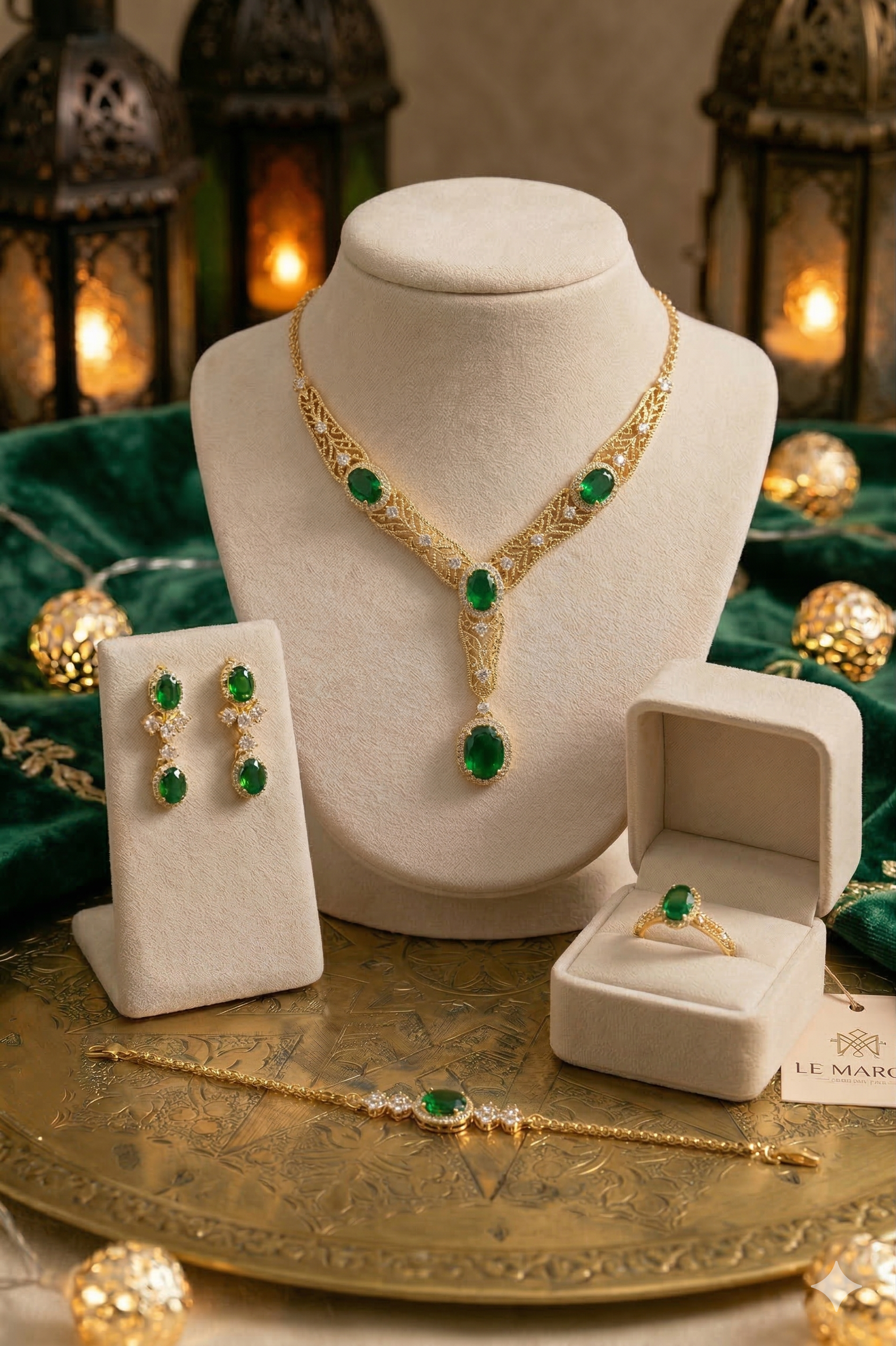 Offrez un cadeau inoubliable avec cet ensemble LE MAROC, présenté dans un écrin de velours vert, symbolisant un amour durable et un goût exquis.