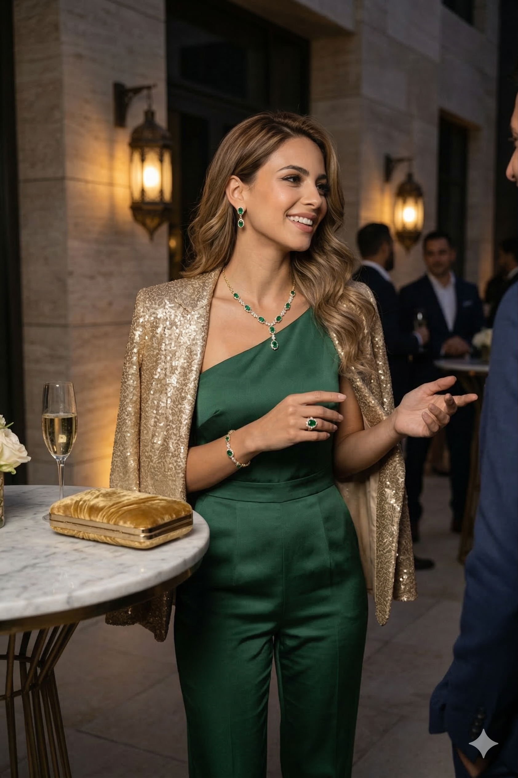 L'éclat doré et les pierres vertes subliment votre allure avec une grâce éternelle.